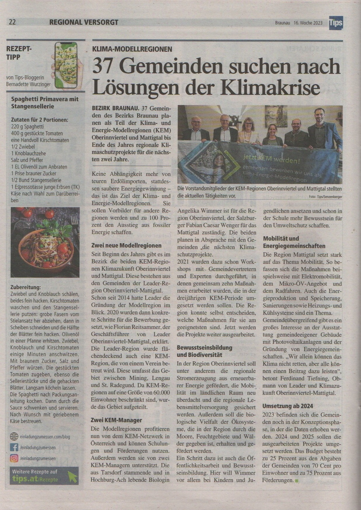 In der heutigen Ausgabe der Tips Braunau wurde ein Bericht über unsere LEADER & KEM Pressekonferenz 'Klimazukunft startet jetzt' vom 11.04.2023 veröffentlicht.
