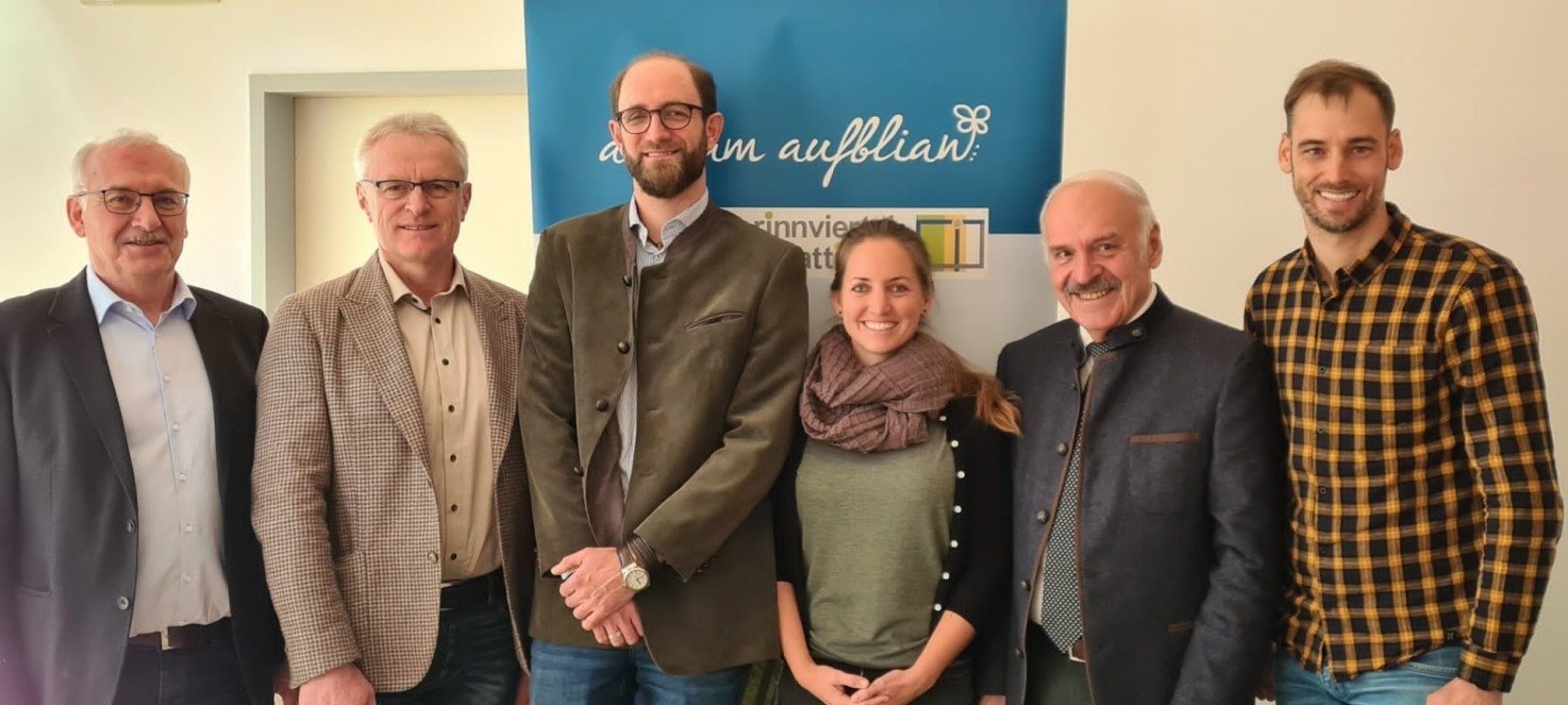 v.l.n.r.: Bgm. David Valentin (Finanzreferent), BR Ferdinand Tiefnig (Obmann), Fabian Caesar Wenger (KEM-Manager "Klimazukunft Mattigtal"), Angelika Wimmer (KEM-Managerin "Klimazukunft Oberinnviertel"), Friedrich Schwarzenhofer (Obmann Stv.), Florian Reitsammer (Geschäftsführer LEADER Oberinnviertel-Mattigtal)
