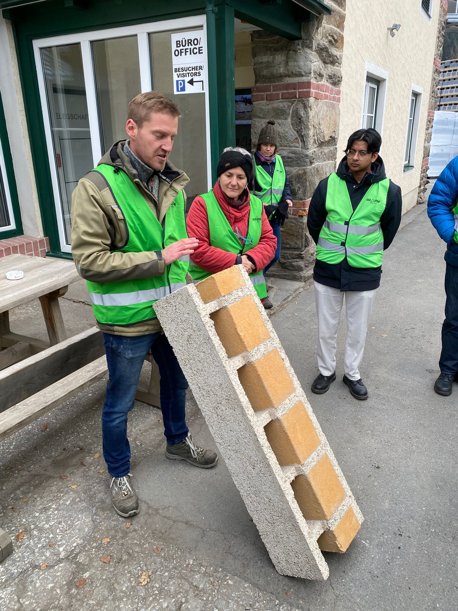 Ein besonderes Highlight war die Exkursion zur Firma ISO Span, einem Vorzeigebetrieb im Bereich Naturbaustoffe. Holzspäne und Restholz aus der regionalen Holzverarbeitung werden dort mit minimalem Energieaufwand zerkleinert und gemeinsam mit Naturstoffen wie Zement, Wasser und Mineralien zu Holzspan-Beton verarbeitet – einem ökologischen Baustoff, der CO₂ bindet und die Umweltbelastung reduziert.