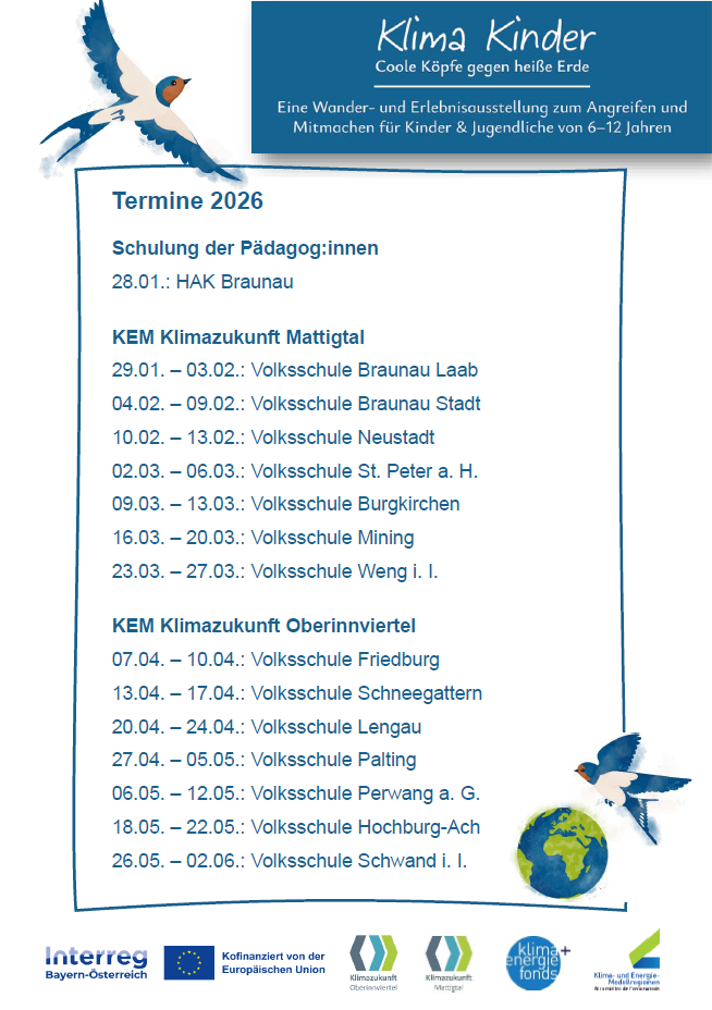 Bewusstseinsbildung fängt schon in den Kinderschuhen an. Die KEM Oberinnviertel und die KEM Mattigtal haben somit gemeinsam mit den grenzüberschreitenden Projektpartnern eine Wanderausstellung über den Klimawandel, für Kinder im Volksschulalter entwickelt. Es handelt sich um ein INTERREG-Projekt. Die Ausstellung soll ab 2024 jeder Volksschule der 37 KEM-Mitgliedsgemeinden zur Verfügung stehen und von Schule zur Schule durch die Region wandern.