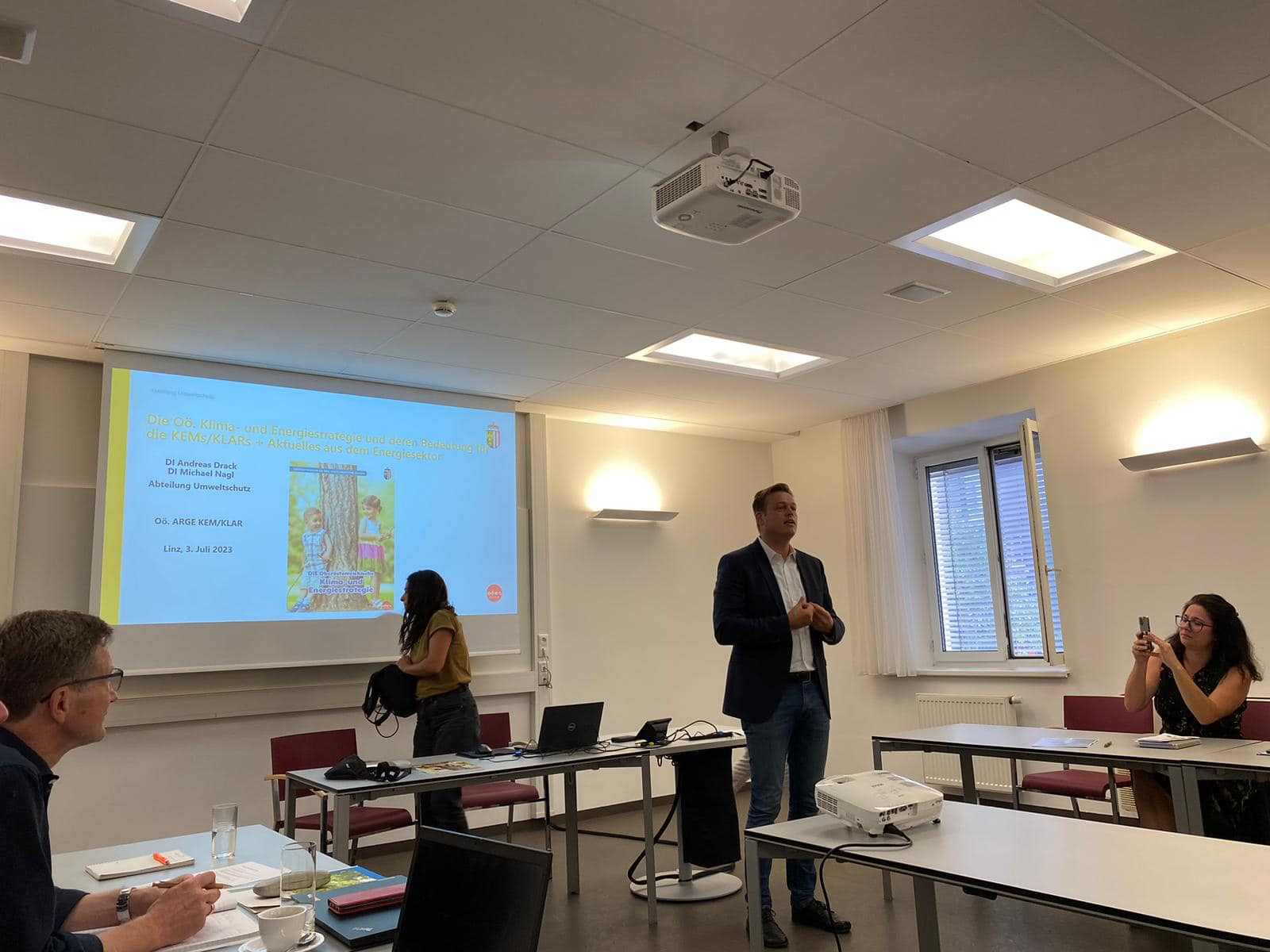 LR Stefan Kaineder begrüßte alle Teilnehmer:innen und führte in das Thema ein. Es folgten spannende Vorträge vom Amt der OÖ Landesregierung, Klimabündnis OÖ und dem Verein der KEM Regionen Österreichs.