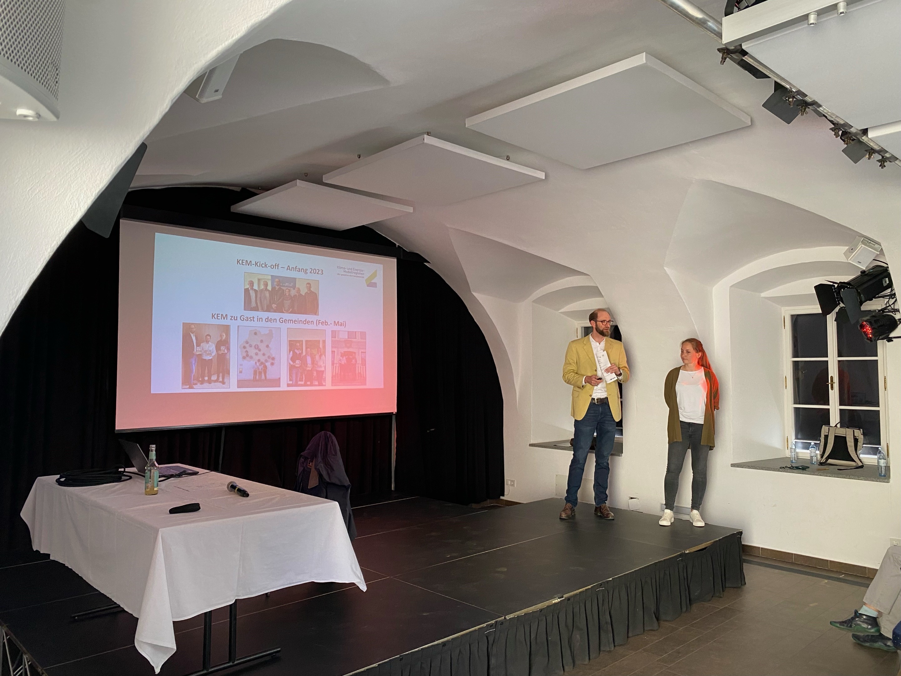 Die beiden KEM-Manager:innen Fabian C. Wenger und Angelika Wimmer bei der Präsentation über ihre bisherige KEM-Tätigkeiten.